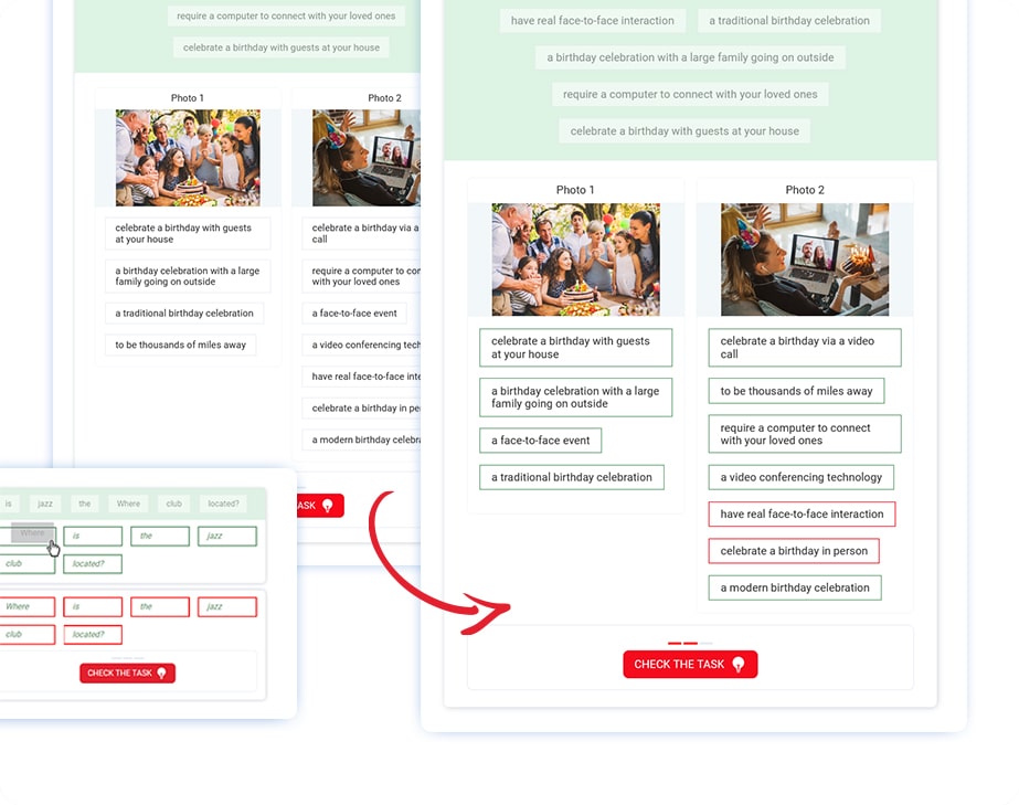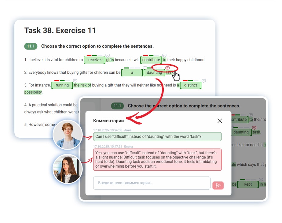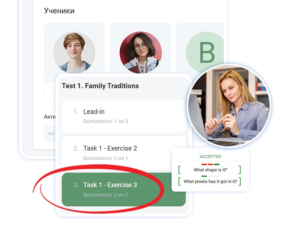 Платформа предлагает разнообразные методы обучения: интерактивные упражнения, аудио, возможность аудиозаписи устных ответов. Всё это делает занятия очень увлекательными. Отрабатываются все навыки, необходимые для успешной сдачи экзаменов. Хочу отметить, что любимый раздел моих учеников – это упражнение на Shadowing, которые представлены очень интересными текстами на красивом английском, с отличной отработкой лексики, в том числе высокого уровня.